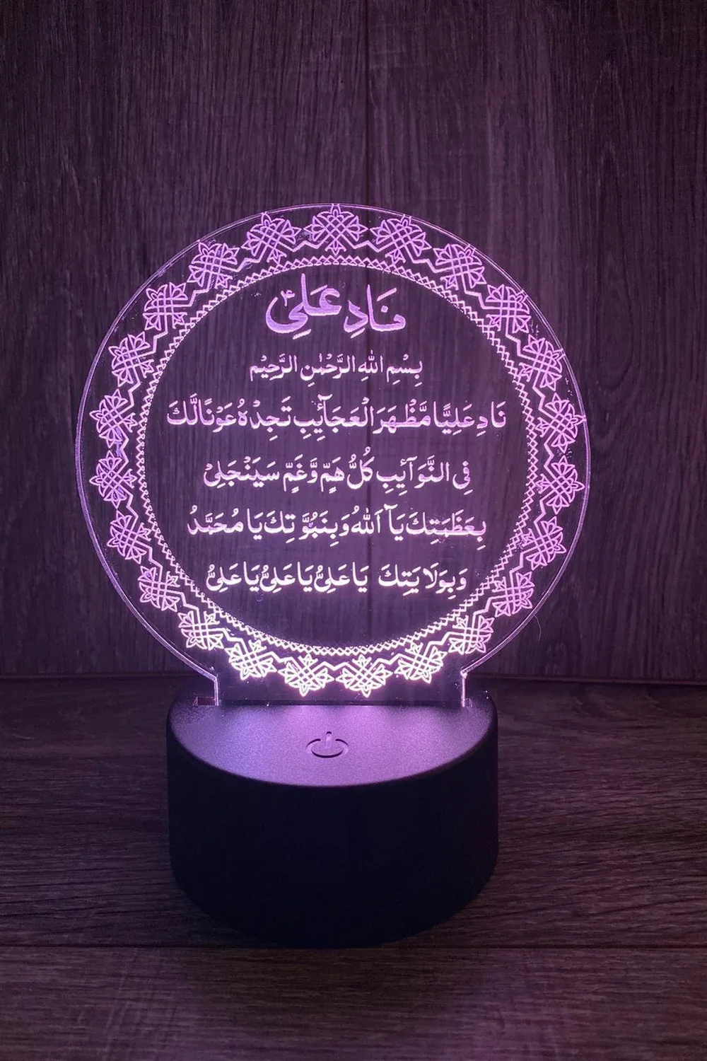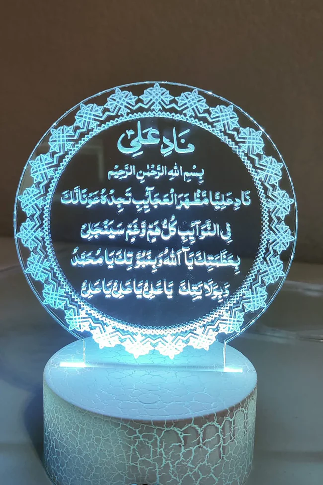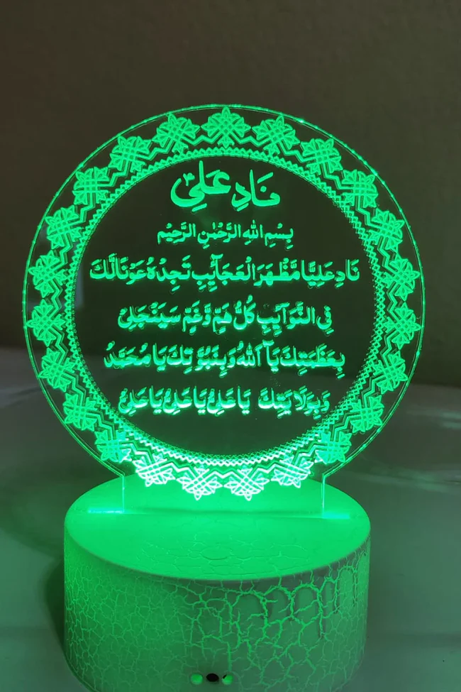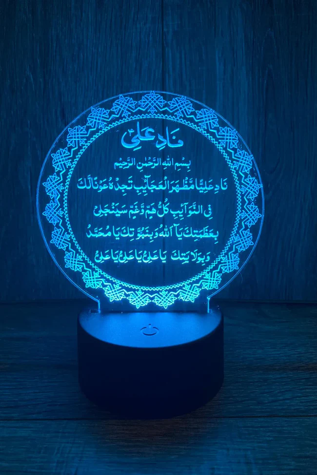 Illuminate your space with the Nade Ali, Ya Ali LED Lamp, a spiritually uplifting décor piece that brings peace and positivity to any environment. Engraved with the powerful Dua Nade Ali, this lamp serves as a symbol of faith, strength, and devotion.